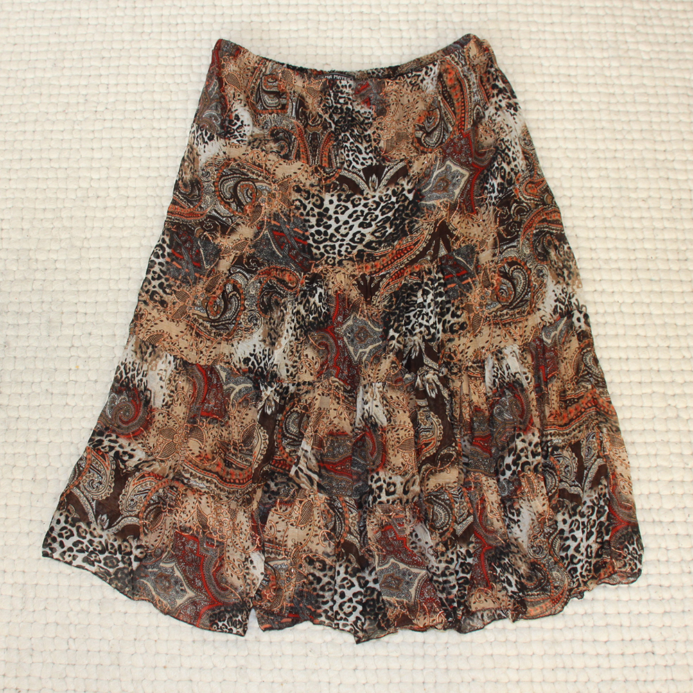 Rok van het merk Alma Mater met elastische band en uitlopend aan de onderzijde. De rok is gevoerd en heeft een mooie print met subtiele gouden details.