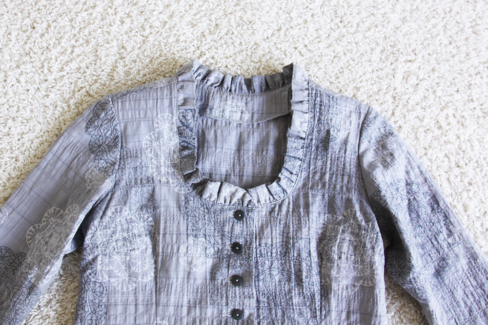 Blouse met mooie prints en ruches bij de kraag. De blouse heeft een ronde kraag en is met knoopjes dicht te maken.