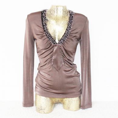 Truitje met v-hals van het merk Class By Roberto Cavalli. Het truitje heeft een bewerking van een soort kristallen bij de kraag en is gemaakt van een mooie, zachte rekbare stof. In de winkel € 479,- (kaartjes aanwezig)