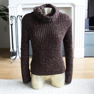 Prachtige trui met roze glans draad verweven in de bruine stof. De trui heeft een col en zit als gegoten.