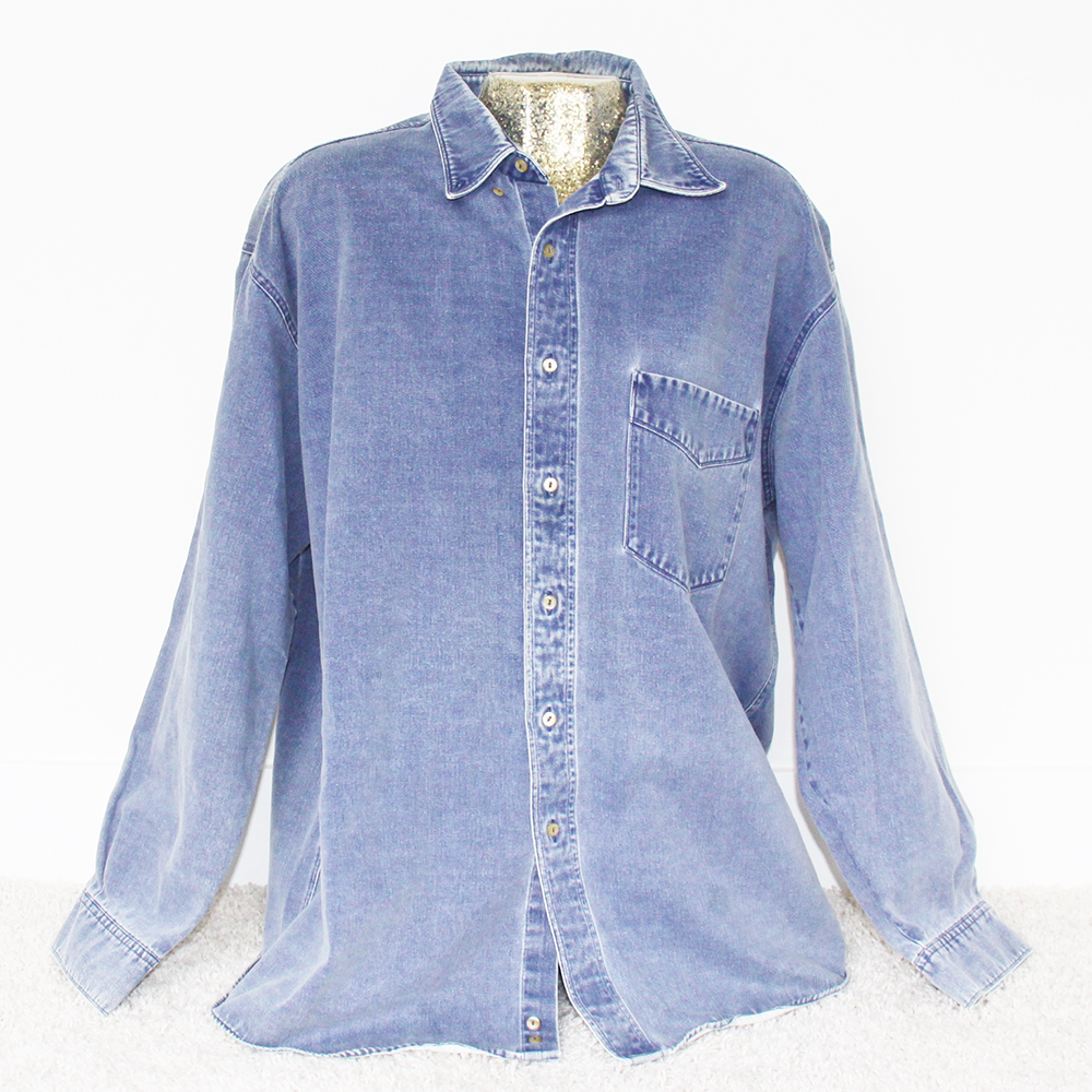 Blouse van het merk Mooie Hugo Boss met borstzakje. De blouse is gemaakt van een soort spijker stof en is met knoopjes dicht te maken.