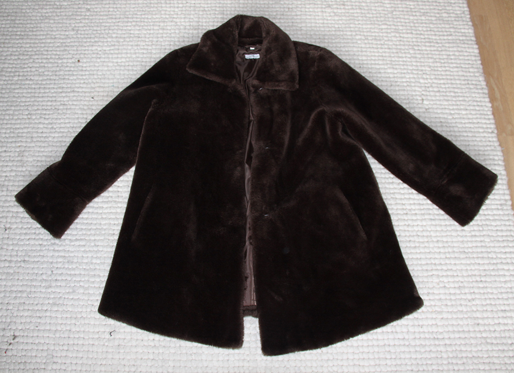 Warme en zachte imitatie bontjas met binnenzak, weggewerkte steekzakken. De jas is aan de onderzijde breder uitlopend en is met haakjes dicht te maken.