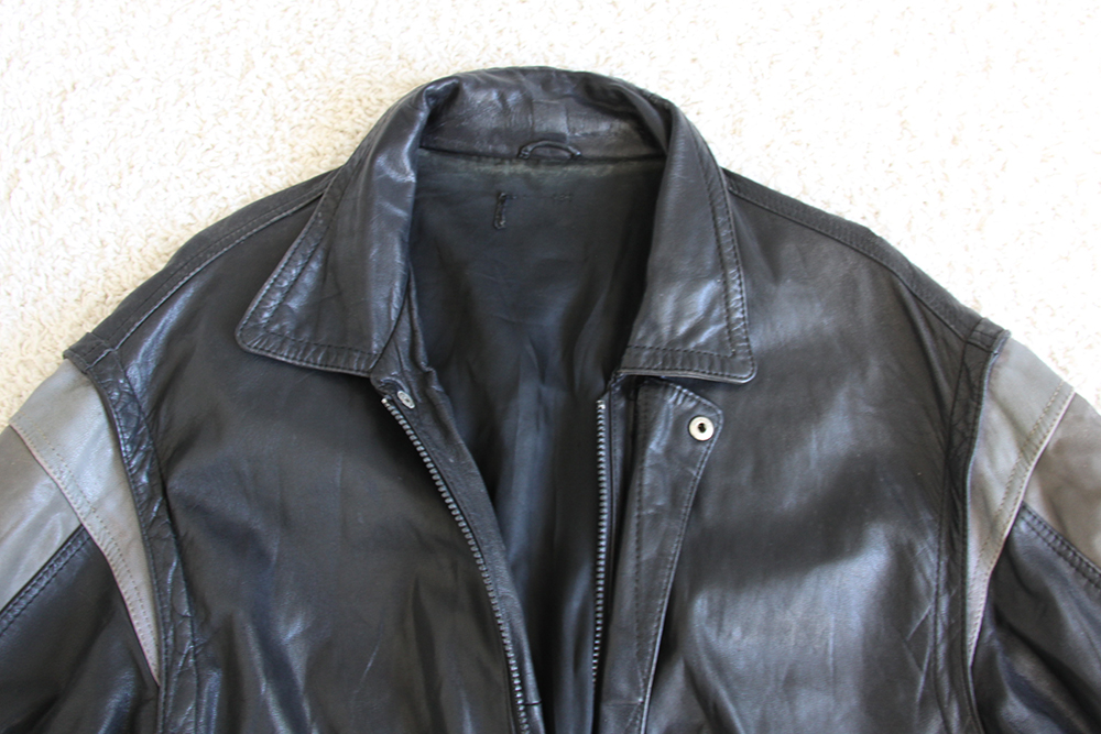 Vintage leren jas klep zakken en weggewerkte steekzakken aan de voorzijde. De jas is bewerkt met verschillende grijze delen bij de armen. De jas is met een rits en drukknopen dicht te maken.