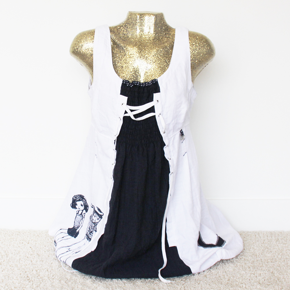 Jurk van het merk We... Love met print en verschillende bewerkingen. De jurk is aan de onderzijde afgewerkt met golfjes.