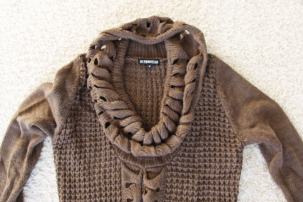 Trui van het merk Superstar met omslag kraag. De trui is bewerkt met kabel detail in het midden aan de voorzijde.