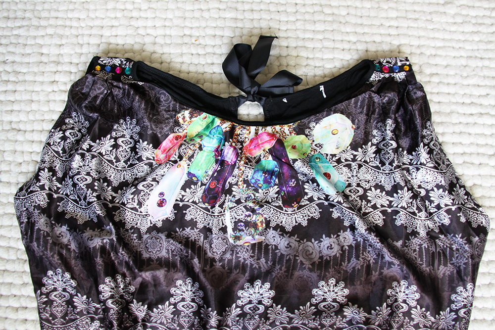 Prachtig topje met mooie print en aan de schouders bewerkt met kristallen. Aan de achterzijde is het topje dicht te strikken.