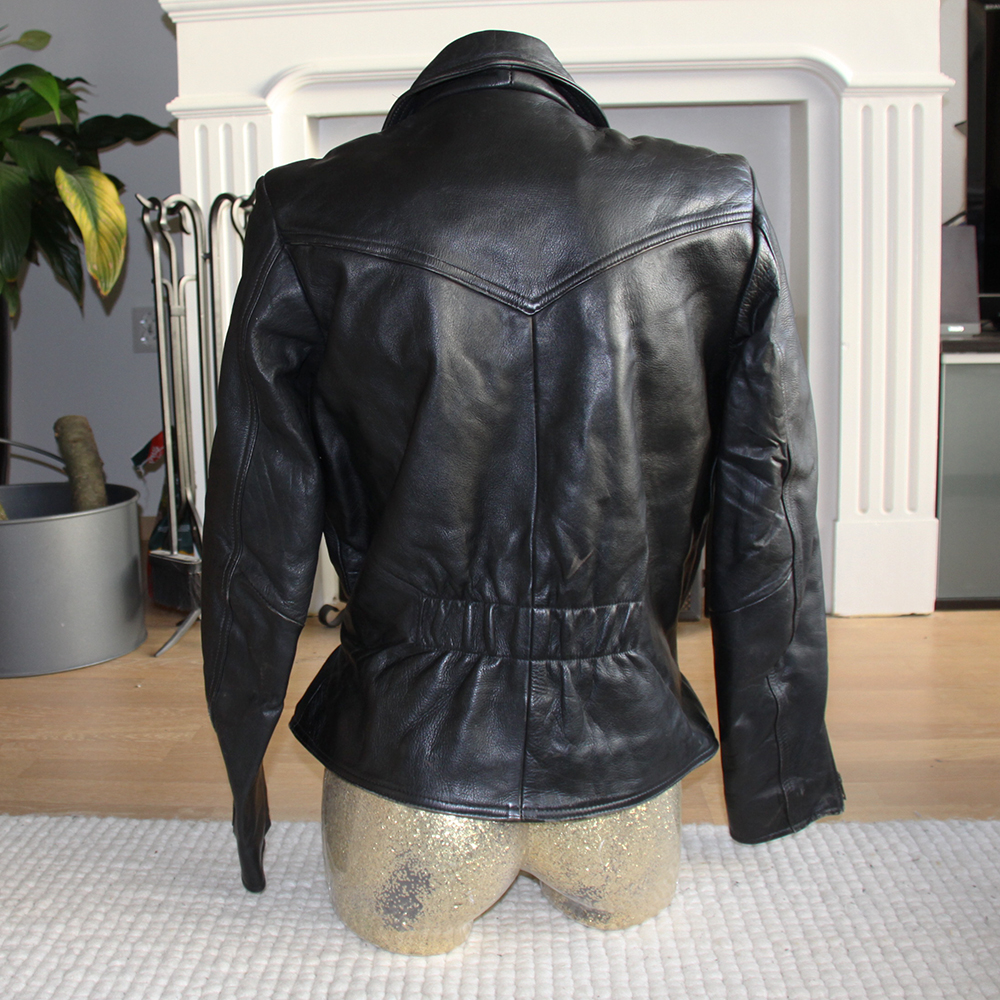 Stevige leren jas met 2 binnen zakken waarvan 1 met rits dicht te maken. De jas heeft 2 rits zakken en de jas is met een rits en gesp riempje vast te maken. Aan de achterzijde heeft de jas een elastische band. Aan de mouwen is de jas dicht te maken met een rits. De linker mouw van de jas is iets geschaafd. verder is de jas z.g.n.