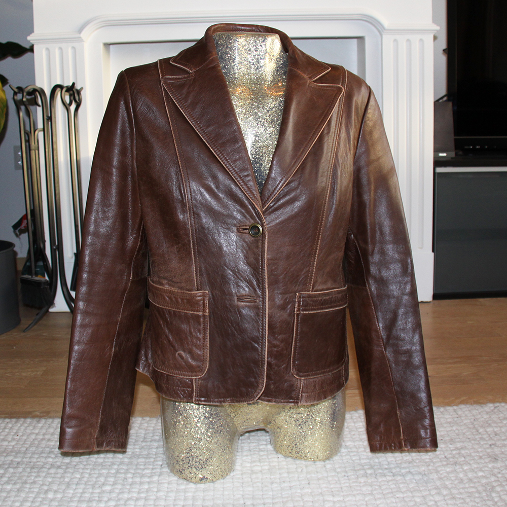 Leren jas met steekzakken en 1 binnen zak met rits dicht te maken. De jas is mooi gevoerd (katoen) en met knopen dicht te maken.